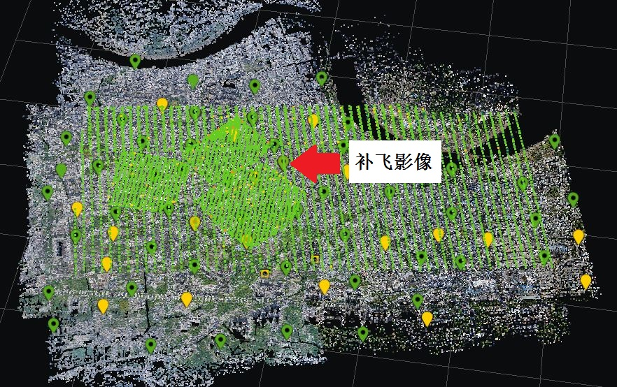 原數據空三與補飛數據空三可分別進行,可加快項目進程,提升效率。在實景三維重建環節將兩部分數據進行融合,通過生成的點云信息檢查數據融合效果。