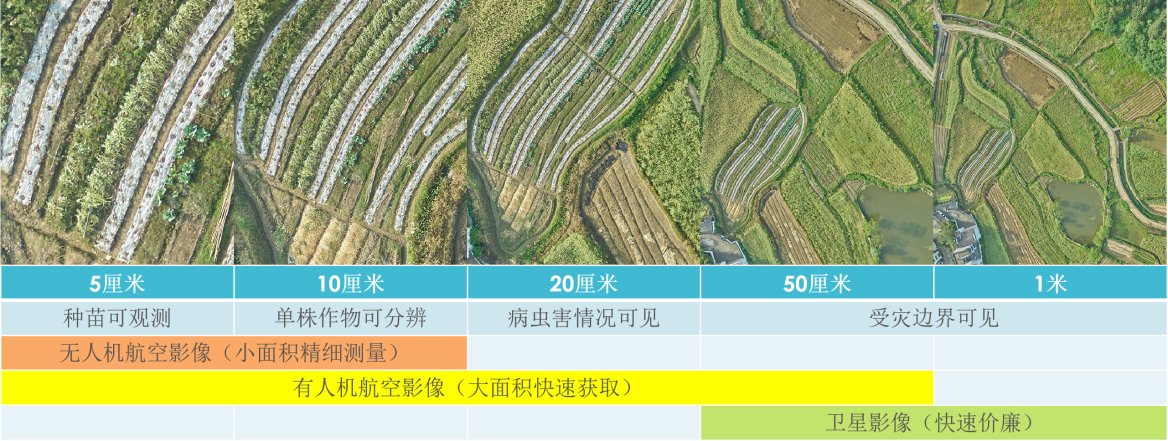 飛燕遙感針對不同分辨率農業遙感影像需求,將衛星遙感與航空遙感相結合,可提供多尺度農業影像數據服務。