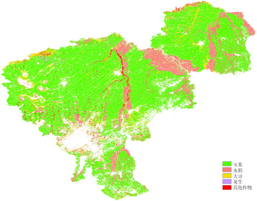 利用遙感數據的可見光、近紅外和短波紅外波段,輔以土地利用現狀數據、地面調查數據、農業歷史統計數據等,通過分析各類農作物在不同物候期的光譜特征、紋理特征,實現農作物分類。