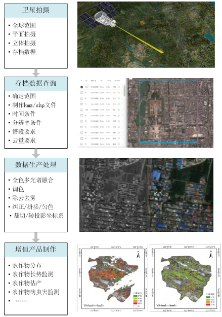 真彩色衛星影像為主,高光譜影像和航空影像為輔,確認農作物護理、生長情況,農作物產量評估。
