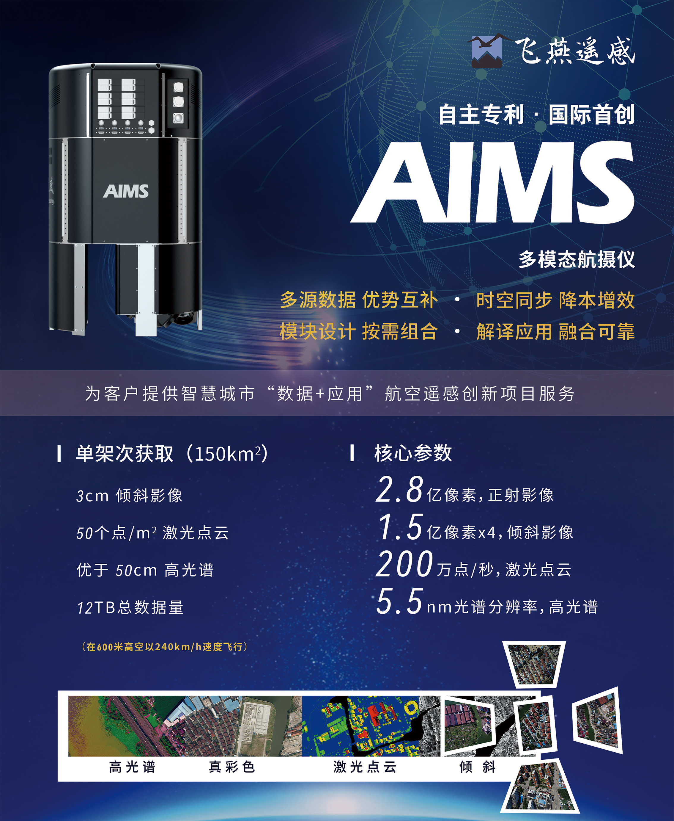 AIMS多模態(tài)航攝儀是目前國際上唯一可同時進(jìn)行正射、傾斜、激光點云及高光譜影像等數(shù)據(jù)采集的航攝裝備,解決了新型基礎(chǔ)測繪和實景三維中國建設(shè)中影像數(shù)據(jù)獲取效率低、成本高、處理速度慢、數(shù)據(jù)融合難等問題。以0.2米分辨率為例,單架次一天可獲取3000平方千米,1個月可獲取30000平方千米(考慮天氣因素)。同一架次獲取的數(shù)據(jù)無需坐標(biāo)點轉(zhuǎn)換,大大增強(qiáng)了不同模態(tài)數(shù)據(jù)之間的分析、利用、共享價值,提升了數(shù)據(jù)獲取與處理效率,成為國內(nèi)數(shù)字航攝儀的引領(lǐng)者。