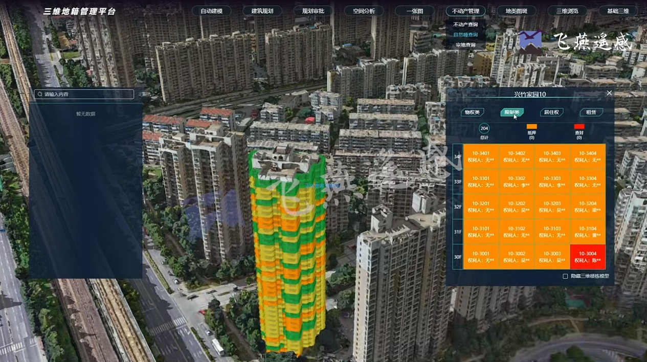 基于城市實景三維模型和相關國土信息數據,提供二三維數據一體化展示、國土資源一張圖管理功能,支持三維宗地、三維樓幢、三維戶室的多層級精細化地籍管理。
