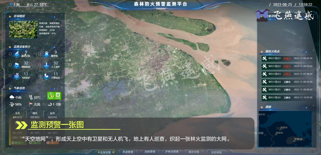 集成遙感技術、GIS技術、三維技術、大數據技術、人工智能等技術,融合多源數據(林區實景三維數據、地理信息數據,“空天地卡人”監測數據,融合基礎資源、森林資源、林業設施設備、林業物資庫、巡護管護人員等數據),實現災情自動巡航監控、煙火智能識別、火點精確定位、火情分析研判、數字預案、輔助決策到災后評估等功能。建立起森林防火事前、事中、事后全過程的業務鏈,有效提高林區日常管理效率,提升林區主管部門對火情監測預警、應急調度等科學決策能力水平。