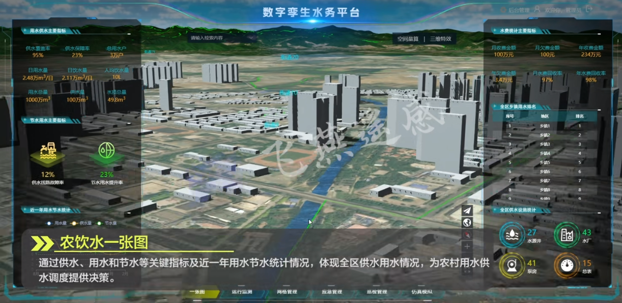 集成數字孿生技術、三維可視化技術,通過建模渲染建立水務設施的結構形狀和位置關系,實現物理對象的數字化表達。打通水務管理中各業務系統的數據孤島,實現水務工程的三維展示、全過程實時監測、故障預警等,協助管理者一目了然地掌握業務趨勢,獲取數據使用價值,完成高效率管理、運營和決策。