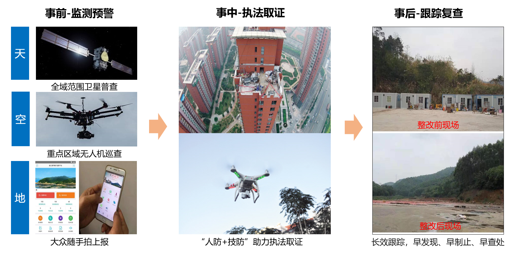 通過衛星、無人機、APP等技術手段,打造衛星影像監測、高清航拍監測和人工無縫巡查相結合方式,形成“地面上報、空中巡查、衛星監測”的“天羅地網”,實現事前監測預警、事中執法取證、事后跟蹤復查覆蓋業務全生命周期,讓“兩違”無處遁形,極大地提高違法建設的防控和查處效率。