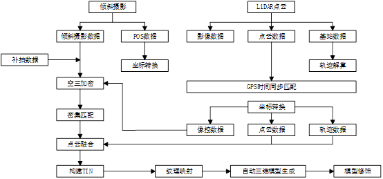 傳統的傾斜攝影在數據采集過程中,存在物體遮擋、航攝盲區等客觀因素限制,造成三維模型扭曲、空洞、紋理拉花等問題。基于無人機傾斜攝影、機載激光雷達、地面激光雷達融合建模的方法,同時采用大疆無人機補拍重點建筑紋理數據對傾斜攝影數據進行補充,將4種數據相融合進行實景三維重建,可以獲得高效率、低成本、精細化的實景三維模型。