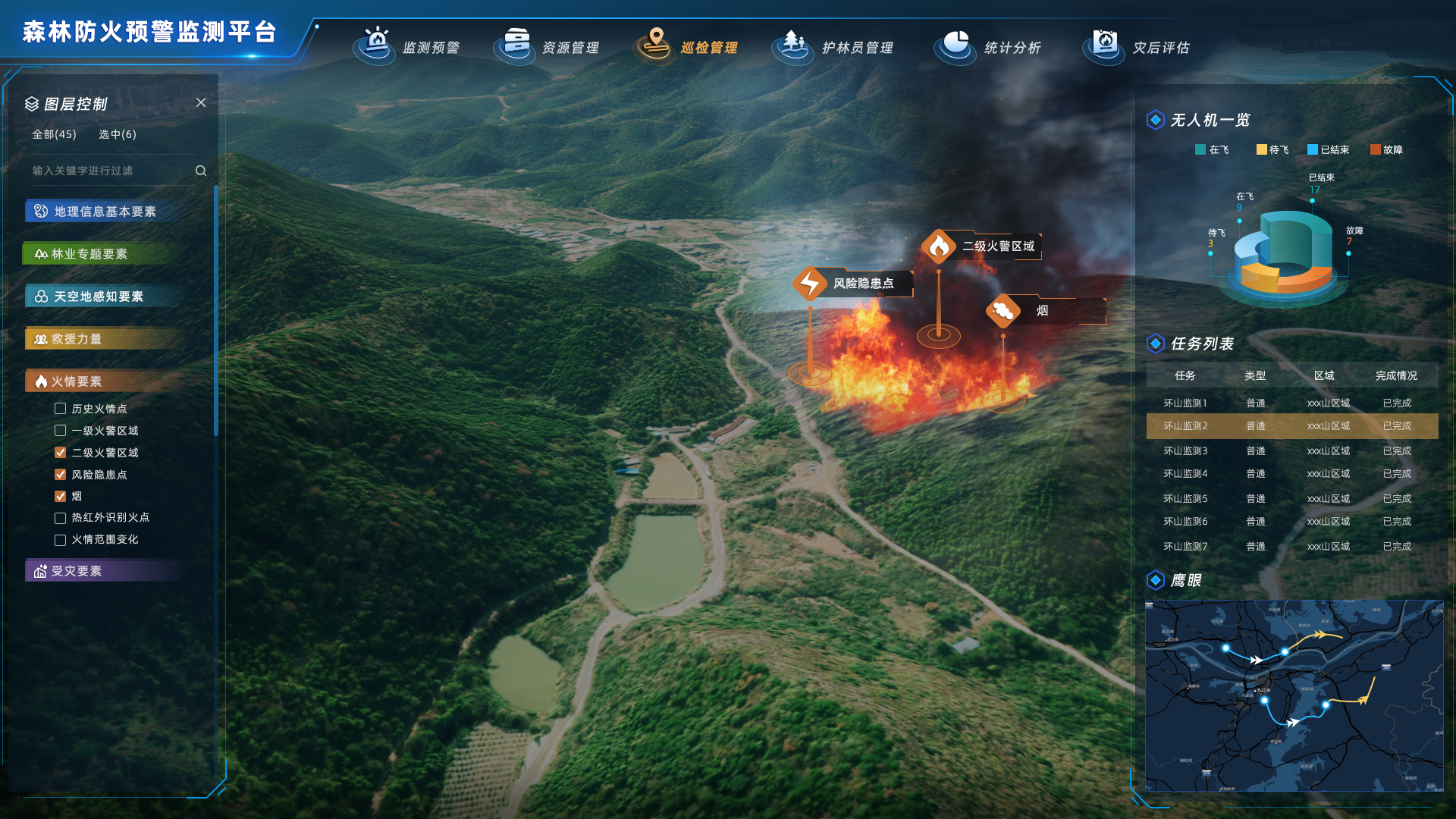 通過有人機與無人機數據獲取并結合物聯網、大數據、GIS地圖等技術,統籌安排,系統治理,構建區域內動態監測感知和實時預警分析,視頻全方位監控等功能于一體,將海量信息進行及時分析與處理,并作出相應結果輔助決策建議,實現區域內安全、環境、資源、生態的智能化、自動化、信息化,提升整個轄區生產、管理和服務水平。