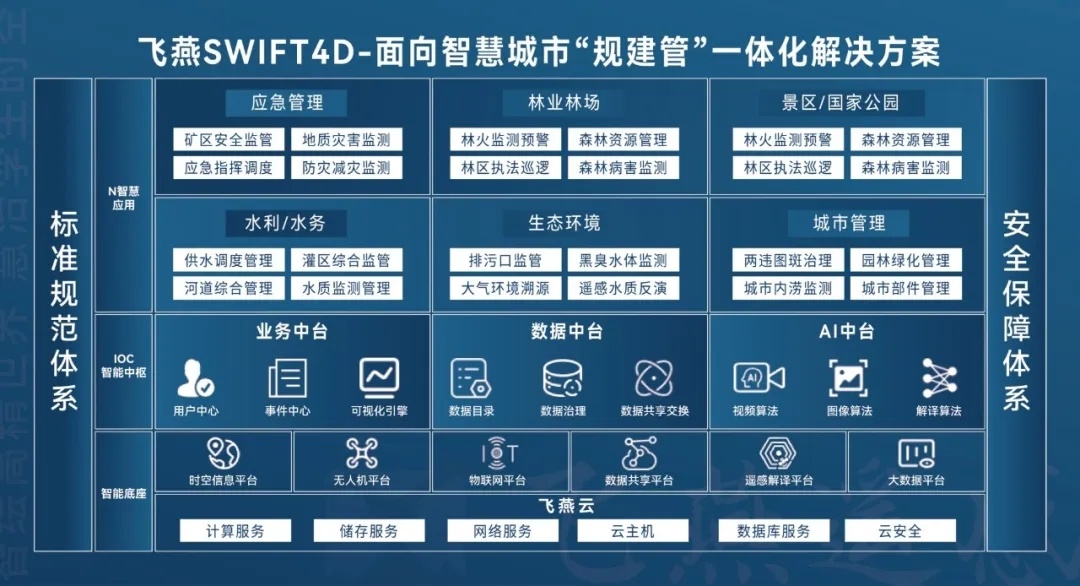 基于更高效規劃、建設新型智慧城市的目標,飛燕遙感自主研發無人機與無人機機庫,按照“一個低空感知網、一個多模態數據中心、1套監測平臺、N個場景應用”的思路研發了SWIFT4D產品體系,在飛燕基礎算力基礎上提供“天空地網”立體化、智能化服務。匯聚地理空間數據、物聯感知數據、管理業務數據等多源數據,建設時空信息基礎平臺、低空監測平臺、遙感解譯平臺、AI智能識別的智能底座,實現對城市的全面感知、智能分析、精準研判、協同指揮和應急處置,助力城市可持續發展。