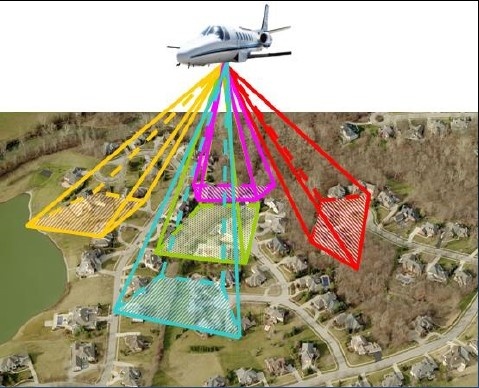 傾斜攝影(傾斜航攝)是通過在同一飛行平臺上搭載多臺傳感器,同時從垂直、多個側視等不同角度采集影像的測量技術。