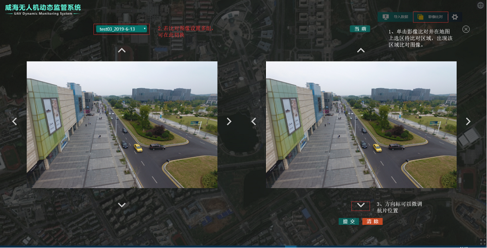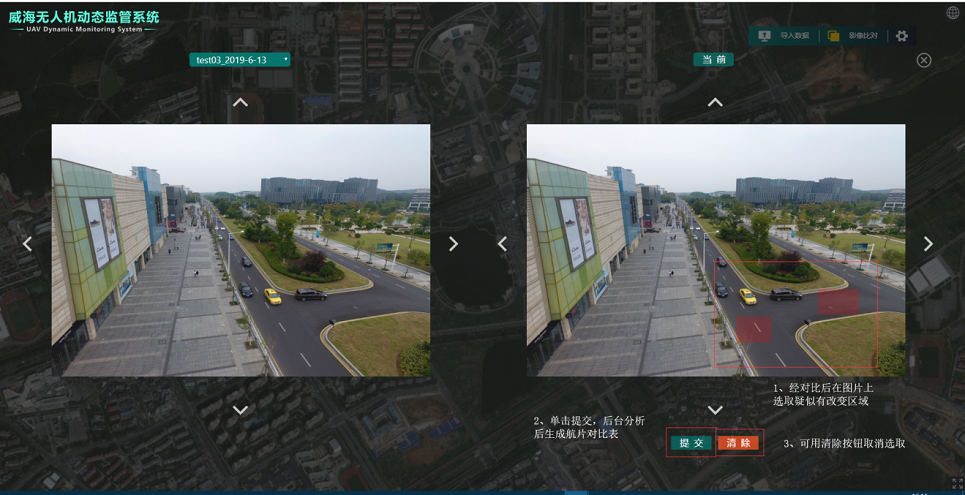 導入后的航片會在地圖上顯示。選擇相應的比對與待比對航片,可以對同地區不同時段航片作比較,以發現地區地物變化情況,框選出地物差異點,并編輯描述信息,可保存在系統后臺。