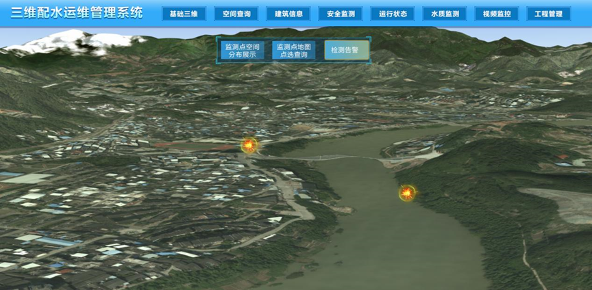 在系統中引入BIM模型,通過三維引擎仿真渲染后,實時直觀地以三維場景展示配水運維工程,并將實時獲取的各類運行信息在三維場景中結合局部三維模型直觀展示,具有配水運維工程空間查詢、建筑信息查詢、安全監測、運行狀態監測、水質監測、視頻監控和工程管理等功能。