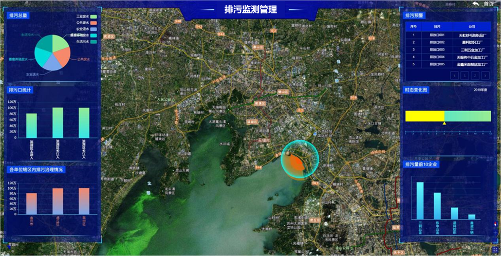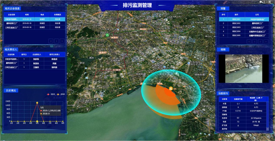 結合物聯網、網絡通信、傳感控制等信息科技手段,對各路管網污水排放、運行、處理等進行全程動態管控,統計排污總量、排污口等信息,并展示各區域內排污治理情況。通過對污染源、管網、泵站、處理廠的水質水量進行監控,實現排污預警預報功能。