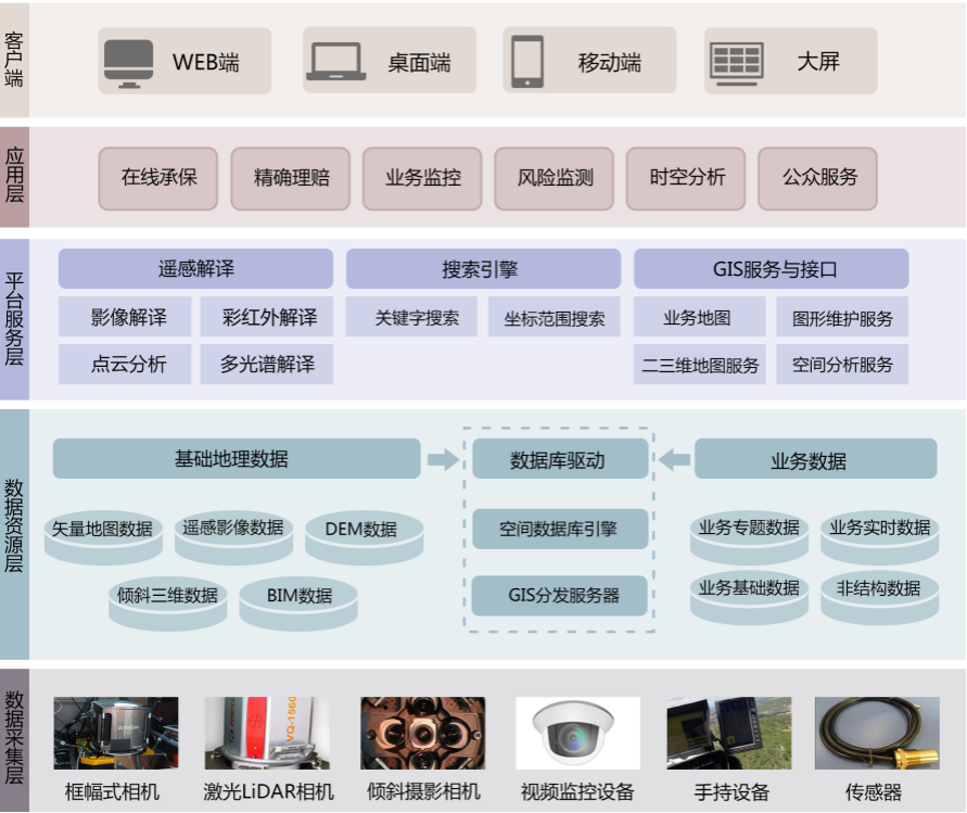 智慧農保系統分為五個層,分別為數據采集層、數據中心、平臺服務層、應用層、及客戶端展示。