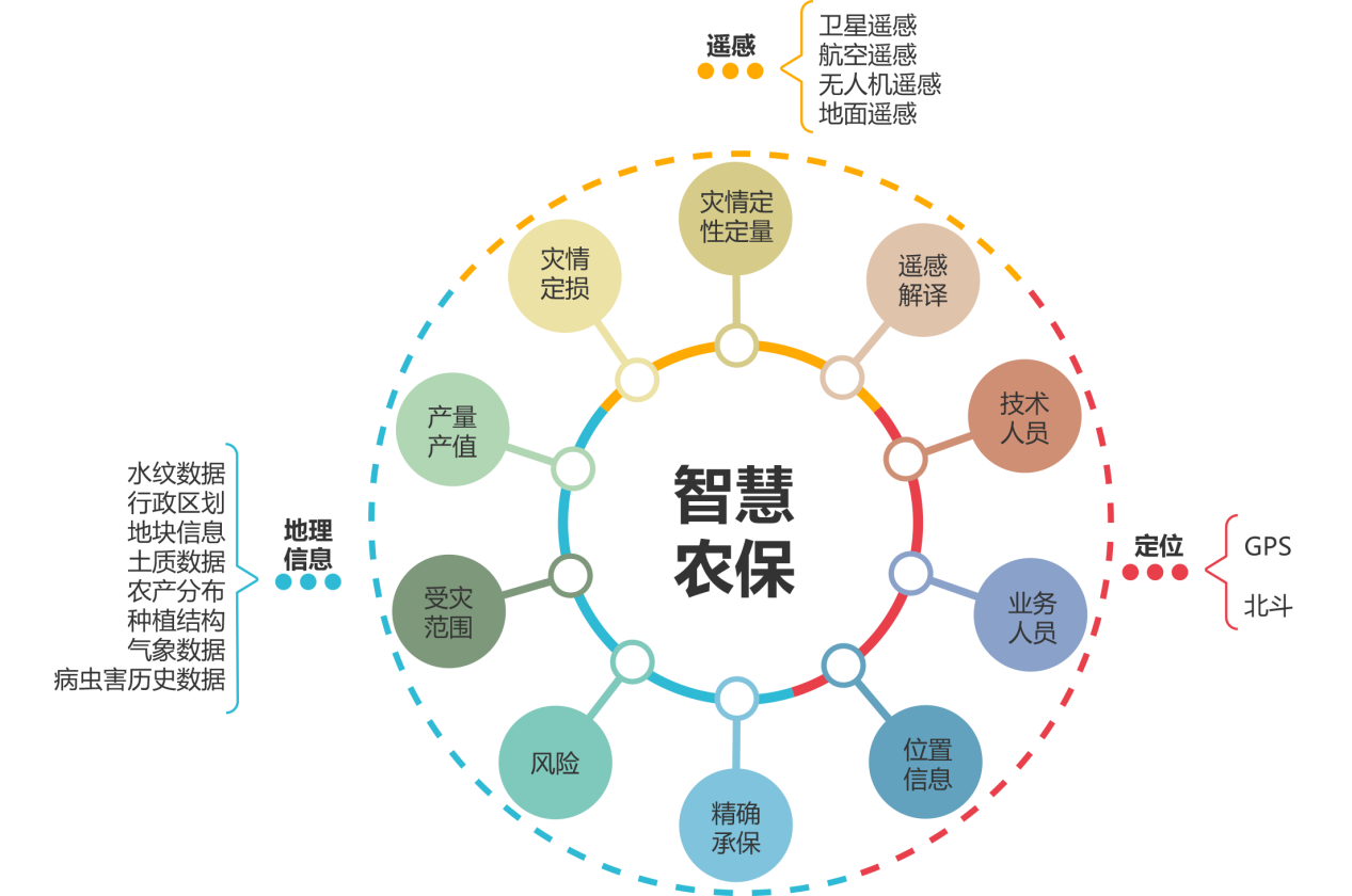 地理信息技術:使用行政區劃數據、地塊數據、農戶分布、種植結構、氣象數據等地理信息數據,通過空間分析、空間運算等地理信息技術,實現精確承保、受災分析、實現有據可依。