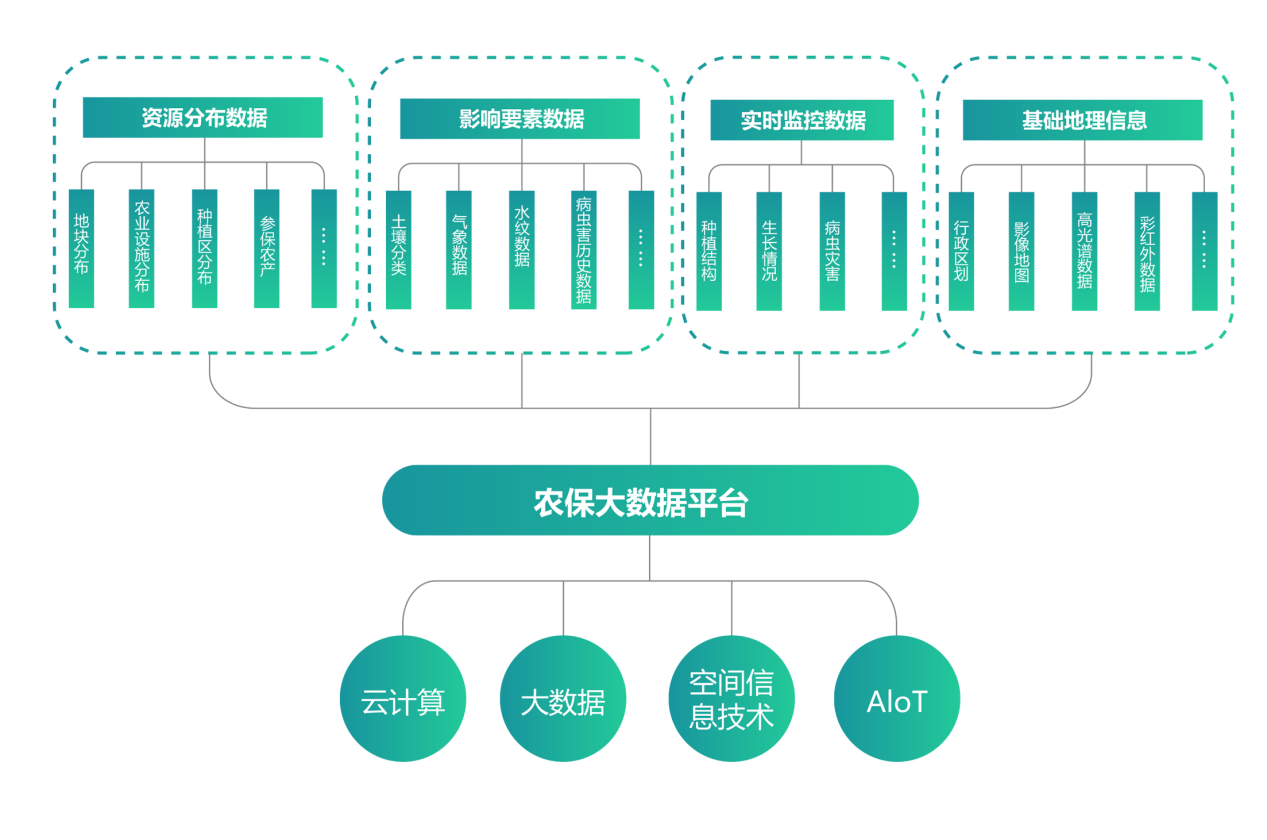 農保大數據平臺依托于云計算技術,大數據技術、空間信息技術、AloT智能物聯網技術,通過資源分布數據、影響要素數據、實時監控數據,實現農保大數據分析、趨勢預測、業務經濟效益、賠率厘定、災害易發區識別等,為農保提供科學依據。