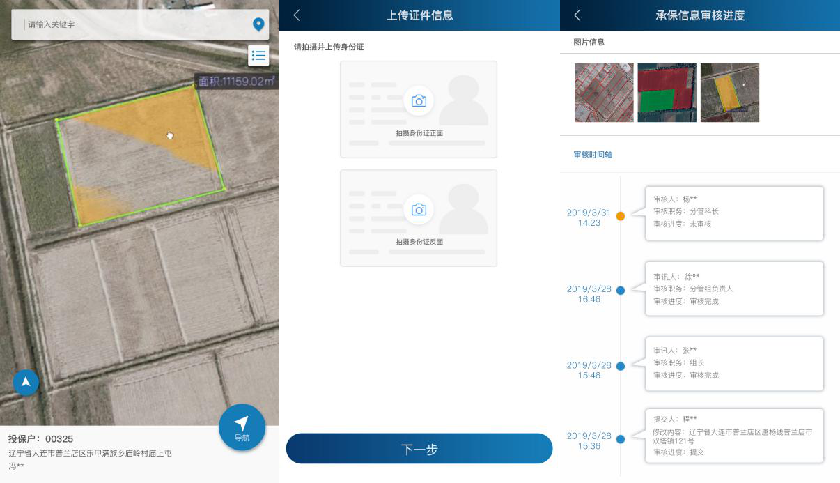 將傳統的承保模式改成在線承保,業務人員首先選擇地塊,自動獲取地塊對應的農戶信息、歷年承保情況,并且通過智能掃描技術,進行身份證信息驗證、銀行卡信息識取,通過客戶端一鍵上傳承保信息,生成電子保單;審核人員獲取電子保單后在線調取影像資料、歷年情況、風險預測結果等信息輔助審核,即提高了工作效率,還增強了業務信息的準確性。