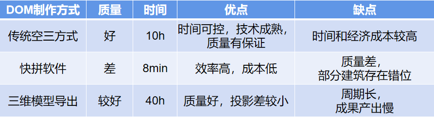從三種方式制作的正射影像可以看出,質量方面傳統空三方式制作的正射影像和通過三維模型導出的正射影像精度較好,快拼影像質量要差一些,尤其是高層建筑投影差明顯,甚至會出現錯位現象。三種方式制作正射影像的優缺點如表所示。