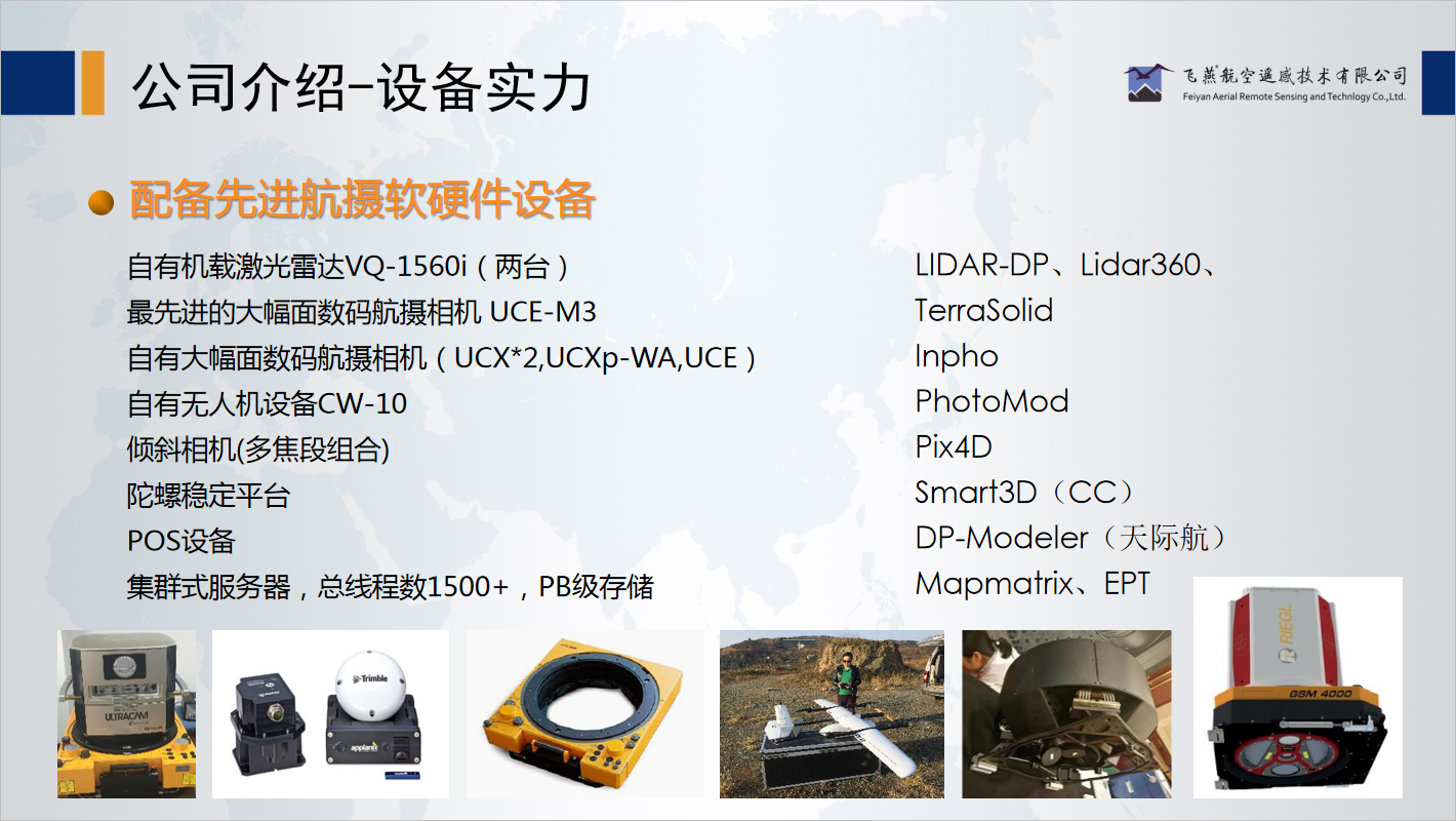 飛燕遙感配備兩臺機載激光雷達VQ-1560i、一臺5億像素傾斜攝影相機、五臺大幅面高精度UC系列數碼航攝儀、多種無人機及輔助設備,是全國航攝設備裝備最頂尖的企業之一。